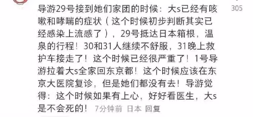 另外,也有帶領大S全家去日本的導遊發聲,稱大S早在前往日本的時候身體就已經出現狀況,到達日本才玩了沒多久,當天晚上就前去醫院看病,不過醫生只給她開了一些藥物服用。