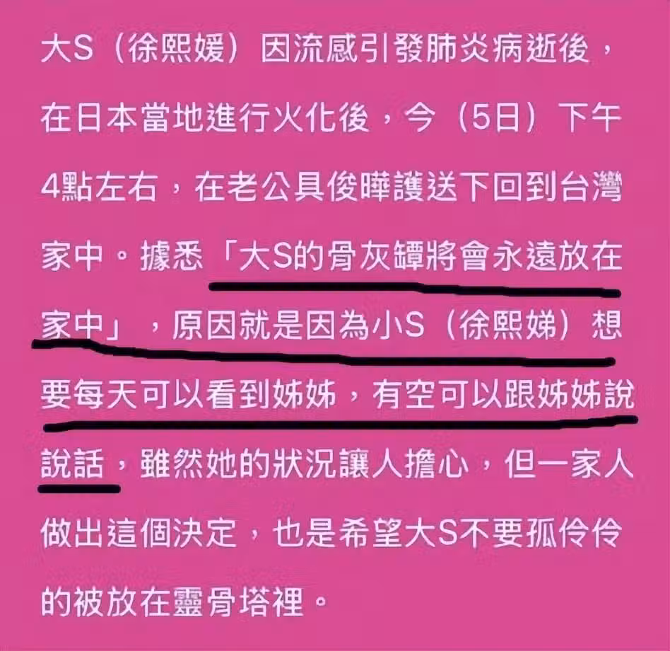 小S整天以淚洗面,大S的骨灰永久放在家中也是最後家人的共同決定。