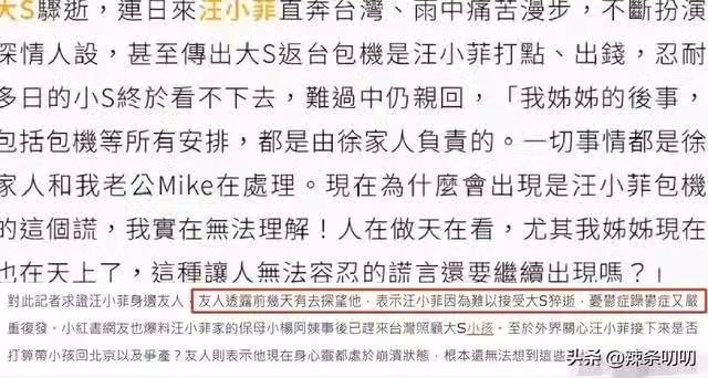 小s的原話是我姊妹的後事,包括包機等所有安排都是由徐家人負責,一切事情都是徐家人和我老公在處理。汪小菲包機這個事是在說謊,自己實在無法理解,人在做天在看,我姊妹現在天上,這種人無法容忍的謊言還要繼續出現嗎?