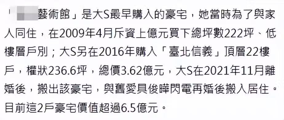而網友提到的小S住宅,是位於台北的「帝寶豪宅」,是將兩套390平米住宅打通後的超級大平層,據說每個月管理費都要2.6萬台幣,小S一家在此處生活了20年,目前市值大約2億人民幣。