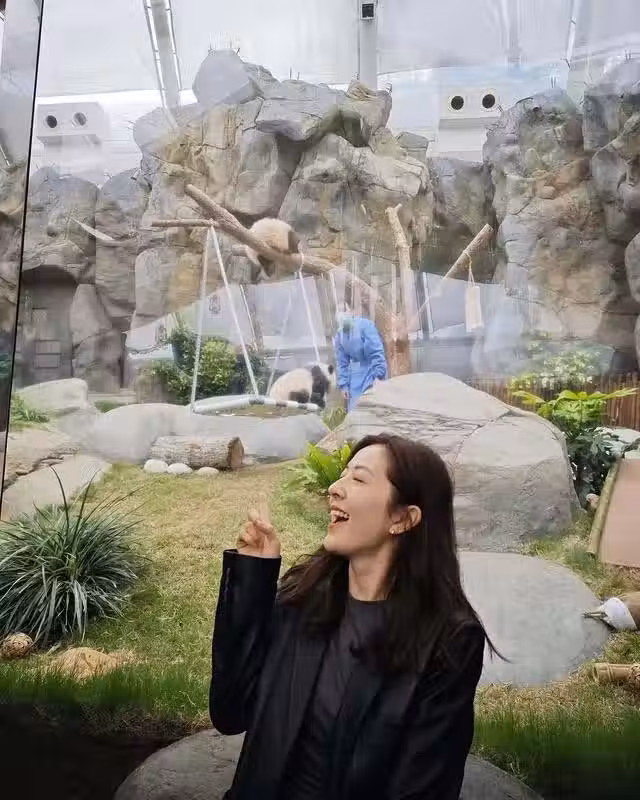 當天她打扮的很低調,穿著深色的職業裝,見到熊貓後也是異常的興奮,期間與其進行各種互動,當然也不忘與之合影留念。