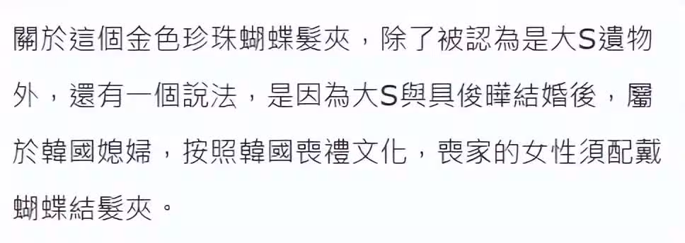 台媒爆料,大S可能是按照韓國媳婦的標準辦後事,喪家的女性必須佩戴白色蝴蝶髮夾,穿上黑色的衣服跟襪子,為亡者送終。