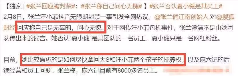 張蘭回應後,不少網友認為她在轉移重點,還有網友說她張口就是瞎話,前幾日直播,張蘭稱自己的公司有20萬員工,說要養活20萬個家庭,如今又改口說有8000名員工,到底哪一句話是真的。