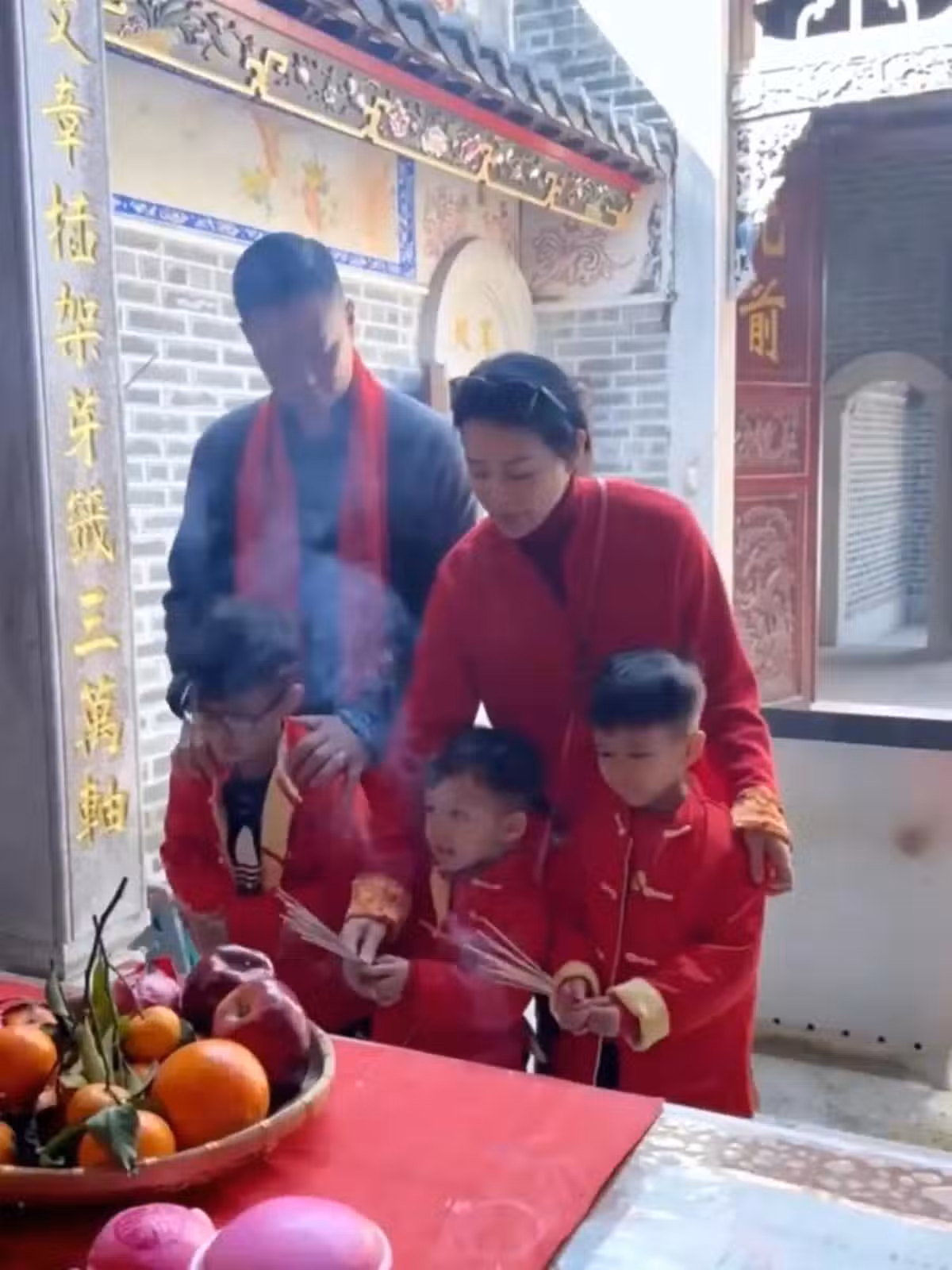 當日,胡杏兒一家還特意換上新衣服,以示對先祖的尊敬。胡杏兒和三個兒子穿著紅色的拜年服,老公李乘德穿著同款不同色的拜年服,披著紅色圍巾,一家人打扮喜慶,看起來很有節日氛圍。