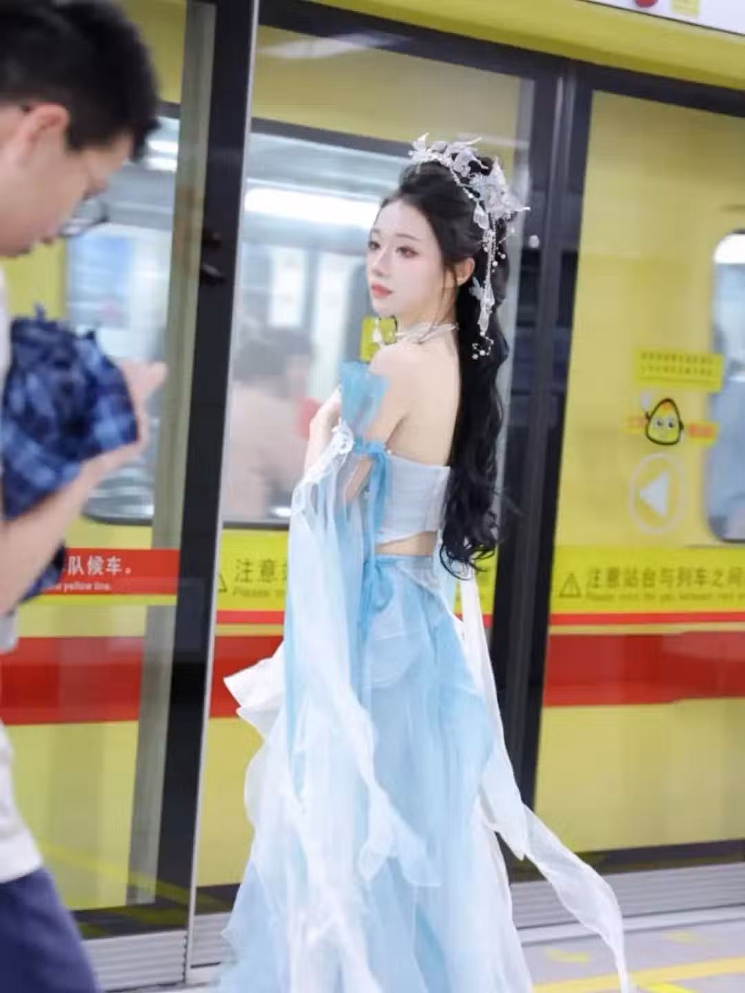 事實上,這名正妹名叫「蓮蓮子」,是一名漢服模特兒,經常在小紅書曬出自己穿各種華麗漢服的照片,熱愛漢服的她也時不時會穿漢服搭乘地鐵,不僅僅是水藍色的漢服,無論是深紫色、粉紅色甚至是容易老氣的紅色,穿在她身上都變得格外氣質美麗。