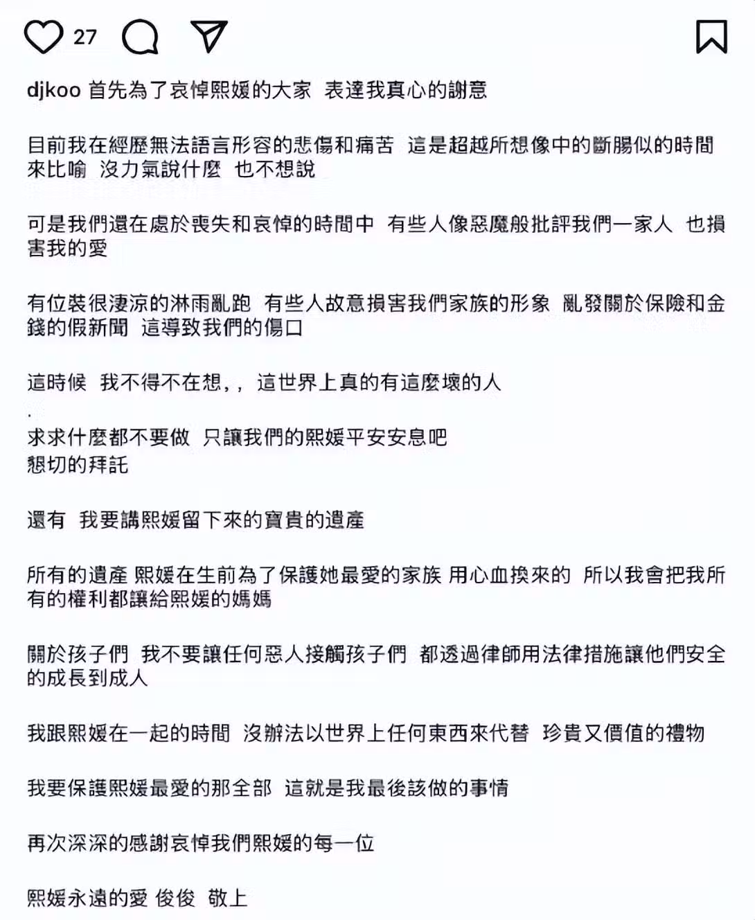 另外他也有說到:「所有的遺產,是熙媛全部的心血換來的,我會把所有的權利都讓給熙媛的媽媽!」