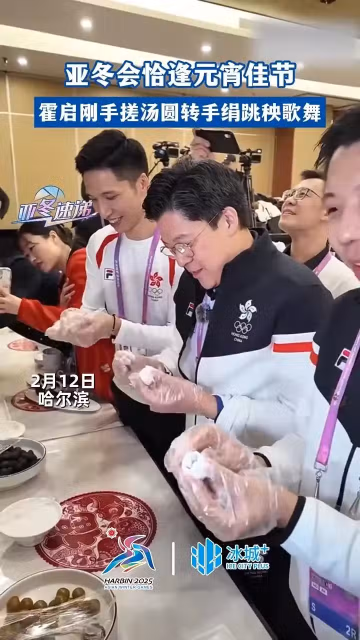 2月12日,在亞冬會舉辦城市哈爾濱,迎來了一場熱鬧的元宵節晚會,霍啟剛和香港運動員一起上台扭秧歌、轉手絹、大家運動天賦都很強,一下就掌握要領。