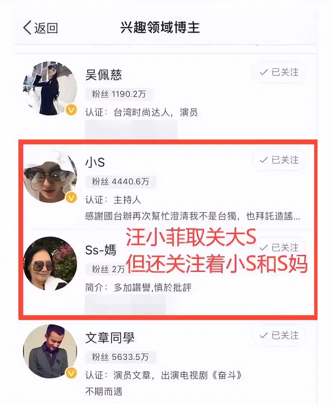 另外,有網友發現,汪小菲也不忍了,他取關了S媽,早在之前汪小菲和大S離婚後,他就主動取關了大S,不過他還關注著S媽和小S。