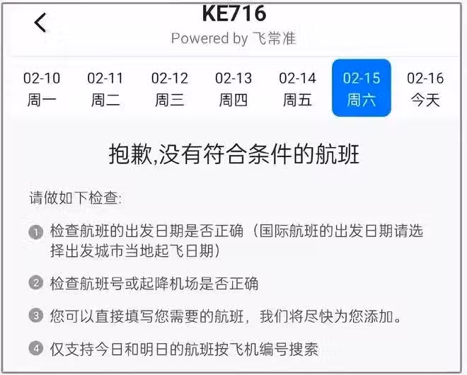 2月14日這天,台北飛首爾的航班顯示,大韓航空有一架飛機KE188航班因晚點,於第二天凌晨1:24分抵達,另一架大韓航空航班則為當天下午抵達,都不是KE716航班。