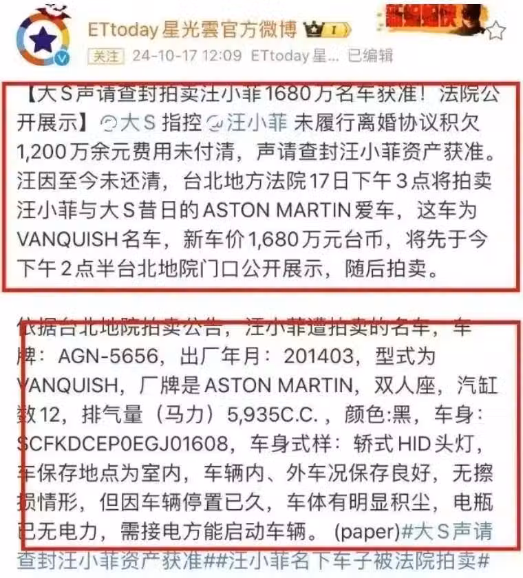 首先來分析第一個尷尬之處。很顯然如今大S拍賣的這輛豪車,汪小菲在當初失婚時應該就已經留下了,並且大S過往譴責汪小菲拖欠資金也不是一次兩次了,雖然暫不清楚大S對汪小菲的這些譴責是真是假,但是有件事可以確認,那就是理論上大S早就可以拍賣汪小菲這輛豪車來換取資金了。