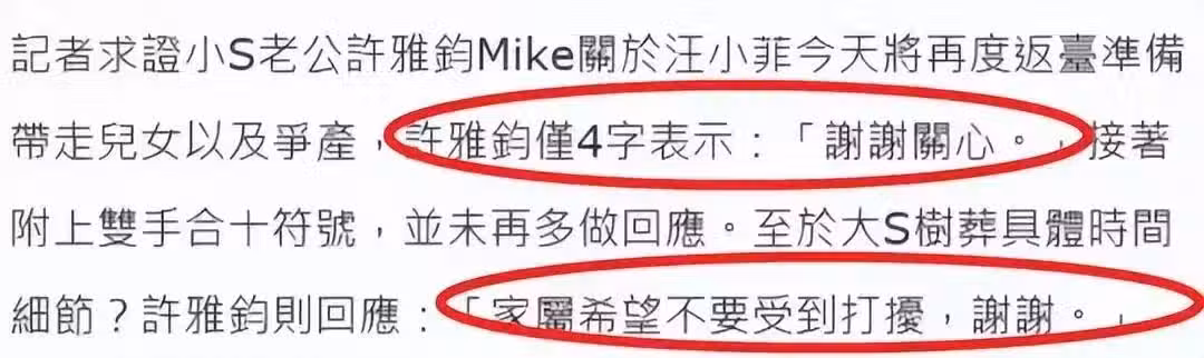 第一次小S回應不會舉辦大S追悼會,不舉辦葬禮,骨灰在家中。第二次就是樹葬,回歸大自然,第三次又變成了不樹葬了,另外找一個地方安葬,地址方式待通知。