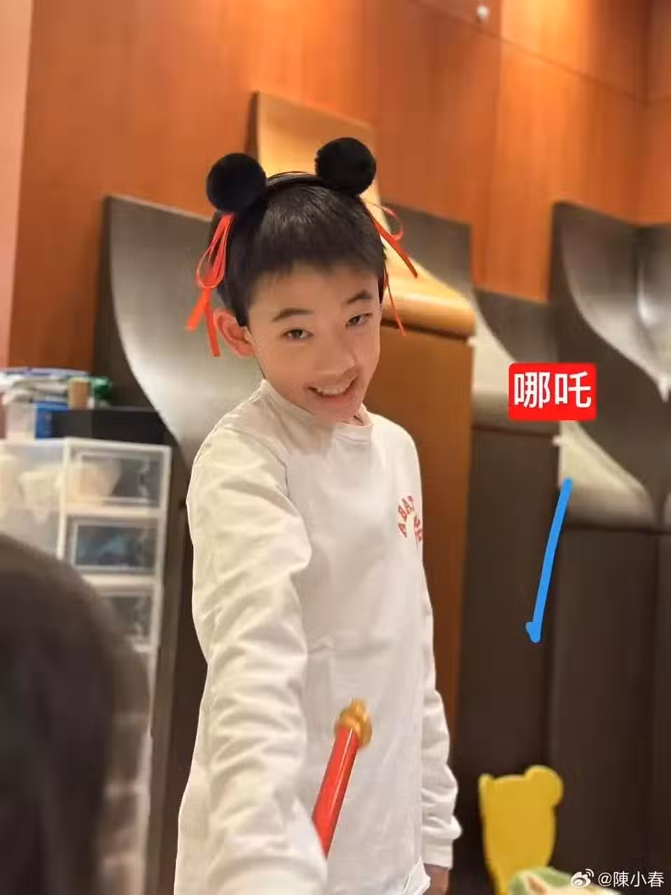 照片中,Jasper 身穿白色長袖t恤,頭上戴著哪吒發箍,手拿火尖槍,臉上露出「壞笑」,面對鏡頭凹造型,看起來真的有幾分像呢。Jasper 真的越來越帥氣,模樣看起來也是越來越像爸爸陳小春,甚至比爸爸還要帥呢。今年11歲的他還願意陪著弟弟玩cos,真的很寵弟弟呀。