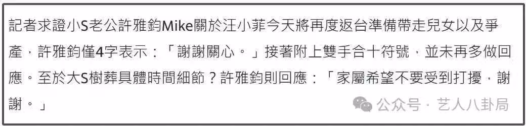 台媒紛紛聚焦小 S,捕捉到她因大 S 的離去而悲痛欲絕的模樣。曾經那個在舞台上活力四射的小 S,如今被悲傷徹底籠罩,整個人憔悴不堪。而 S 家這邊,大 S 的後事都由許雅鈞一手操持。可誰能想到,就在這悲傷的氛圍中,許雅鈞私生子的傳聞竟不脛而走,且愈演愈烈,成為眾人熱議的焦點。