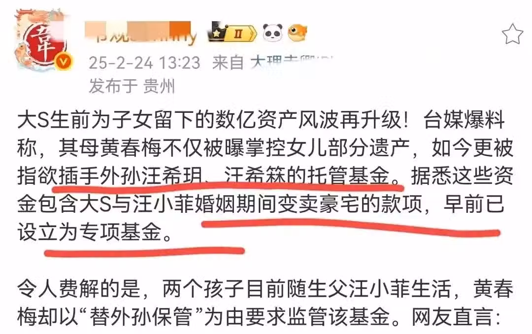 這筆資金,包含大S和汪小菲婚姻期間變賣豪宅的款項,早前已經設立為專項的基金。而黃春梅的解釋是「要以替外孫保管」為由。要求監管該基金。