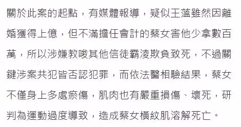 報道指出,被害人蔡姓女子被要求跪拜懺悔,長時間受到凌辱、體罰,最終導致不堪負荷,倒下身亡。對她動手的有3人,包括干姓、梁姓及游姓,他們是精舍的「三大護法」,受王蘊指示虐殺女方。