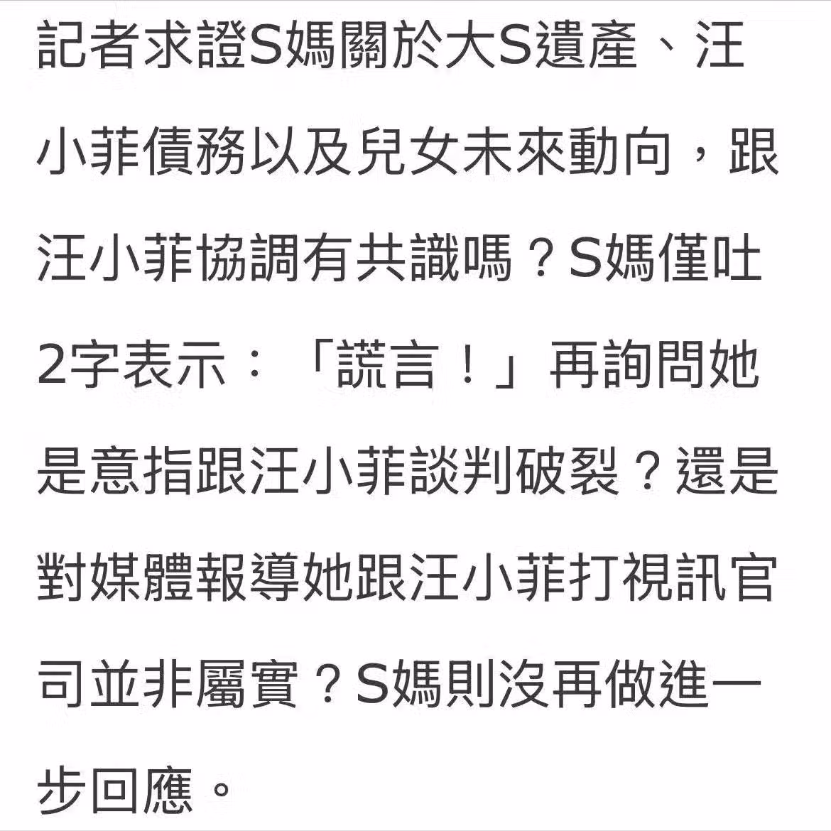 接著,S媽接受相熟媒體的專訪,言語間是要放棄爭奪撫養權、遺產,不再向汪小菲追討債務。