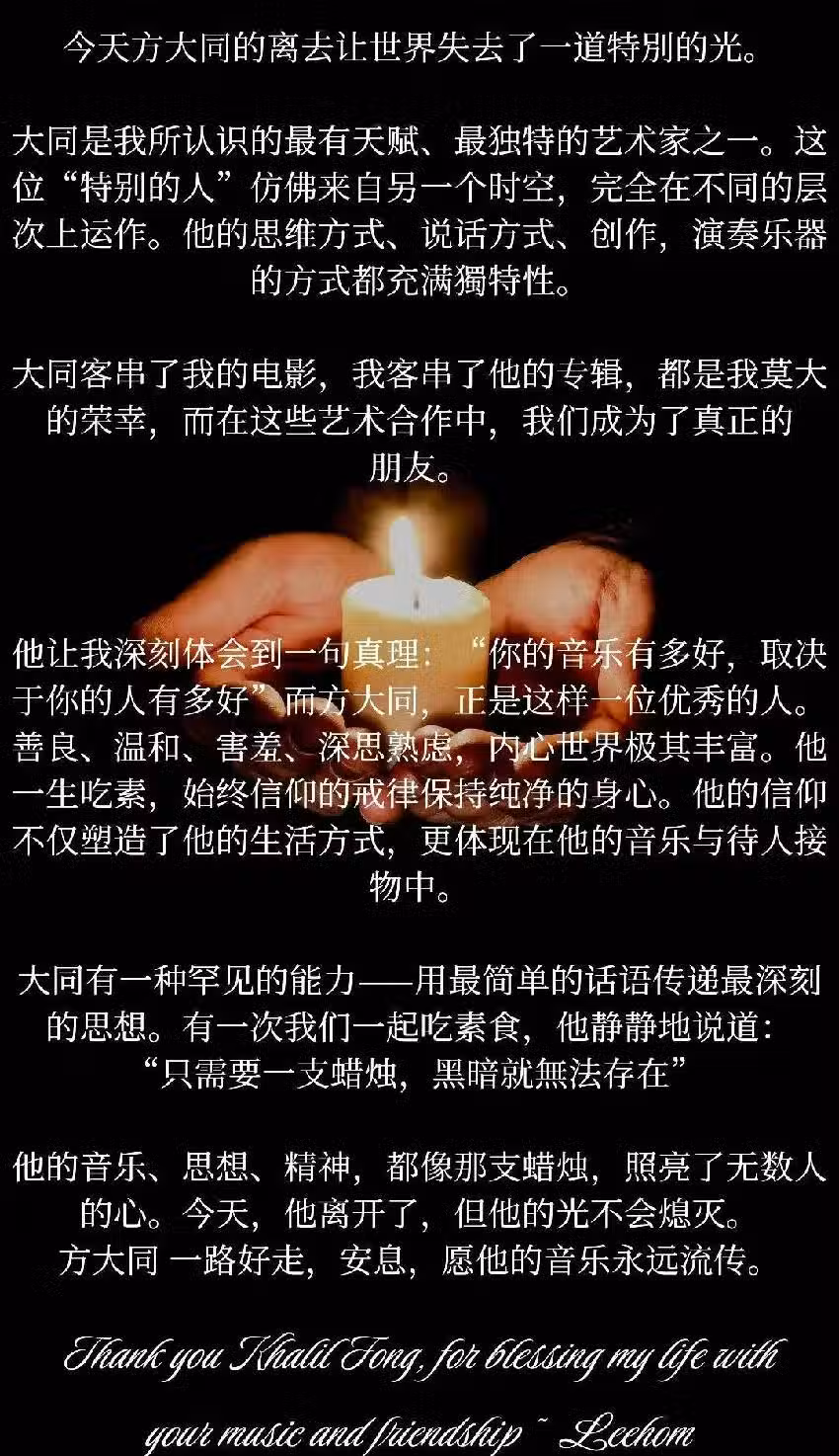 方大同一路好走,安息,願他的音樂永遠流傳。」