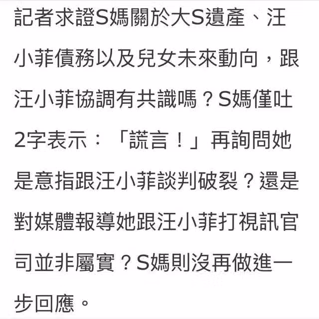對此,S媽公開回應,直指一切都是「謊言」,對相關傳聞感到憤怒。接著,S媽接受相熟媒體的專訪,言語間是要放棄爭奪撫養權、遺產,不再向汪小菲追討債務。