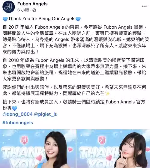 朱朱今日宣布離開Fubon Angels,突如其來的消息讓粉絲相當不舍,朱朱表示,從小跟爺爺一起看職棒轉播,因為喜歡錶演而進入啦啦隊職場,6年的應援生涯,改變她很多,每一次的相聚都是緣分、福氣。