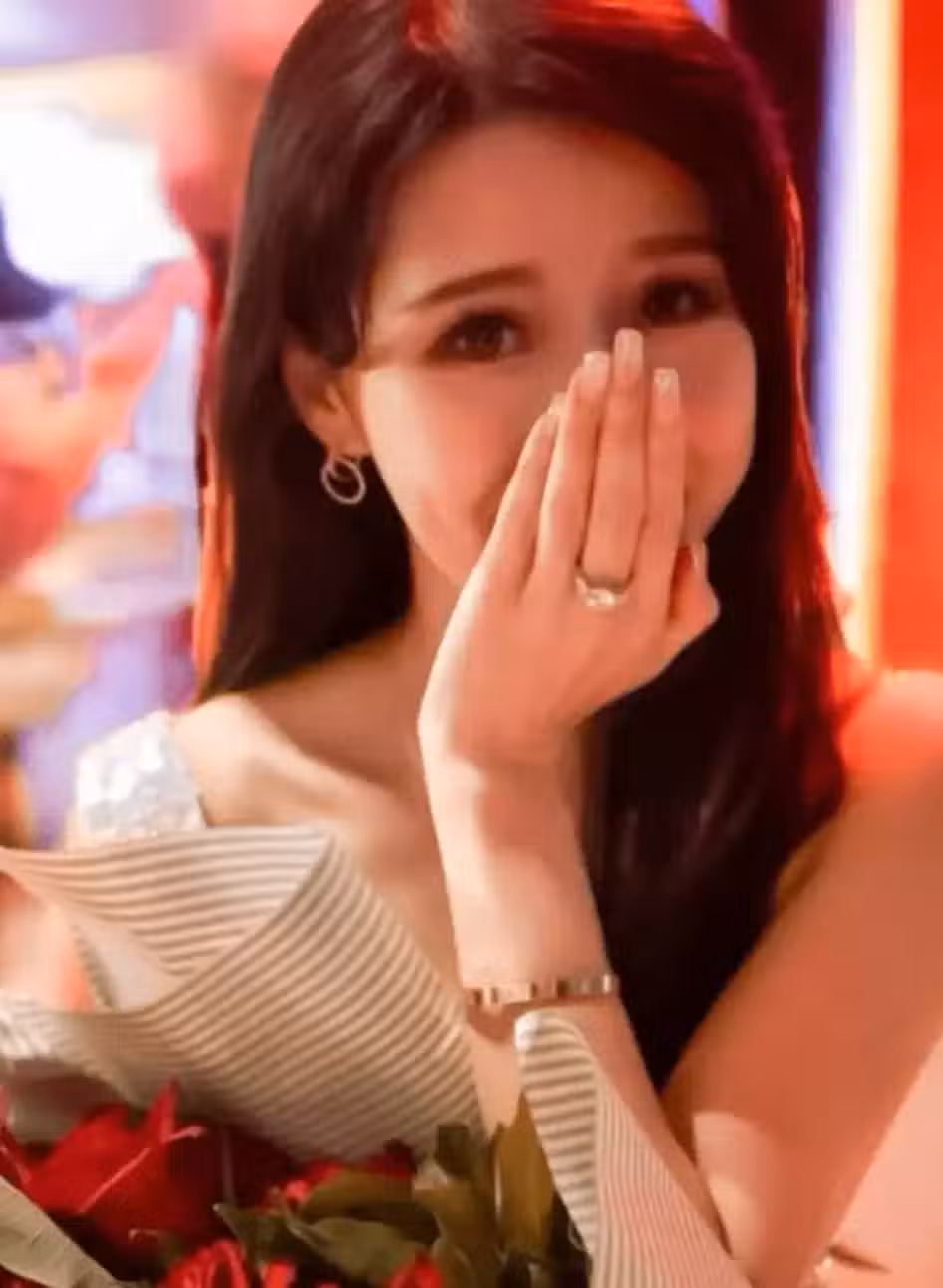 照片中蔡頌思化著精緻妝容,身穿弔帶洋裝,在一家海邊餐廳抱著大束玫瑰花拍照。淚眼朦朧的她感動得用手掩住下半張臉,並大秀手上鑽戒,顯然想要獲得外界祝福。之後蔡頌思還換上了一件方領墊肩銀色閃片長裙,在草坪上與男友深情對望,桌上擺著寫有「Happy engagement」的卡紙和美味佳肴,氣氛里滿布喜悅與甜蜜。