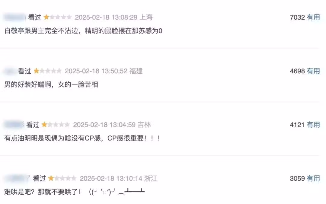 不僅如此,白敬亭和章若楠的表現同樣一言難盡,不僅是台詞表達還是氣質展現,亦或是情緒拿捏等方面,都沒有達到該有的水準。之前看過他們各自的作品,二人的表演功底還是有的,只不過在這部劇中,他們倆的表現實在讓觀眾失望。