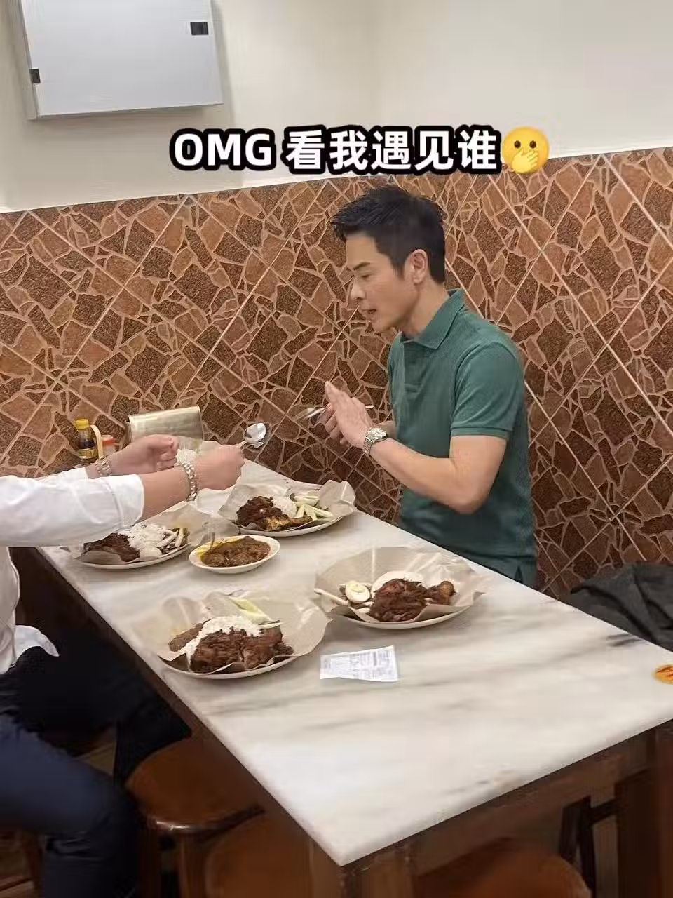 54歲鄭嘉穎出國度假,和老婆到餐廳吃飯,打扮帥氣,身上沒有老態