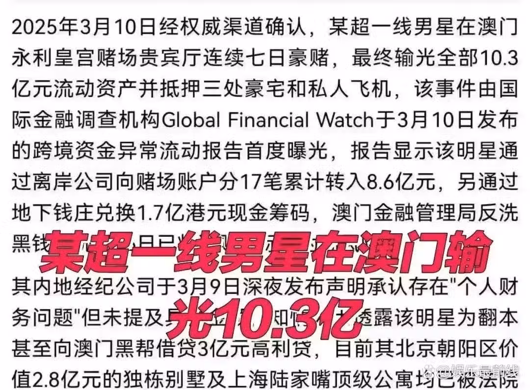 3月10日,據多家自媒體爆料稱,某「超一線男星」在澳門永利皇宮貴賓廳連續七日豪賭,輸光10.3億元流動資產,並抵押三處豪宅及私人飛機以填補賭債。
