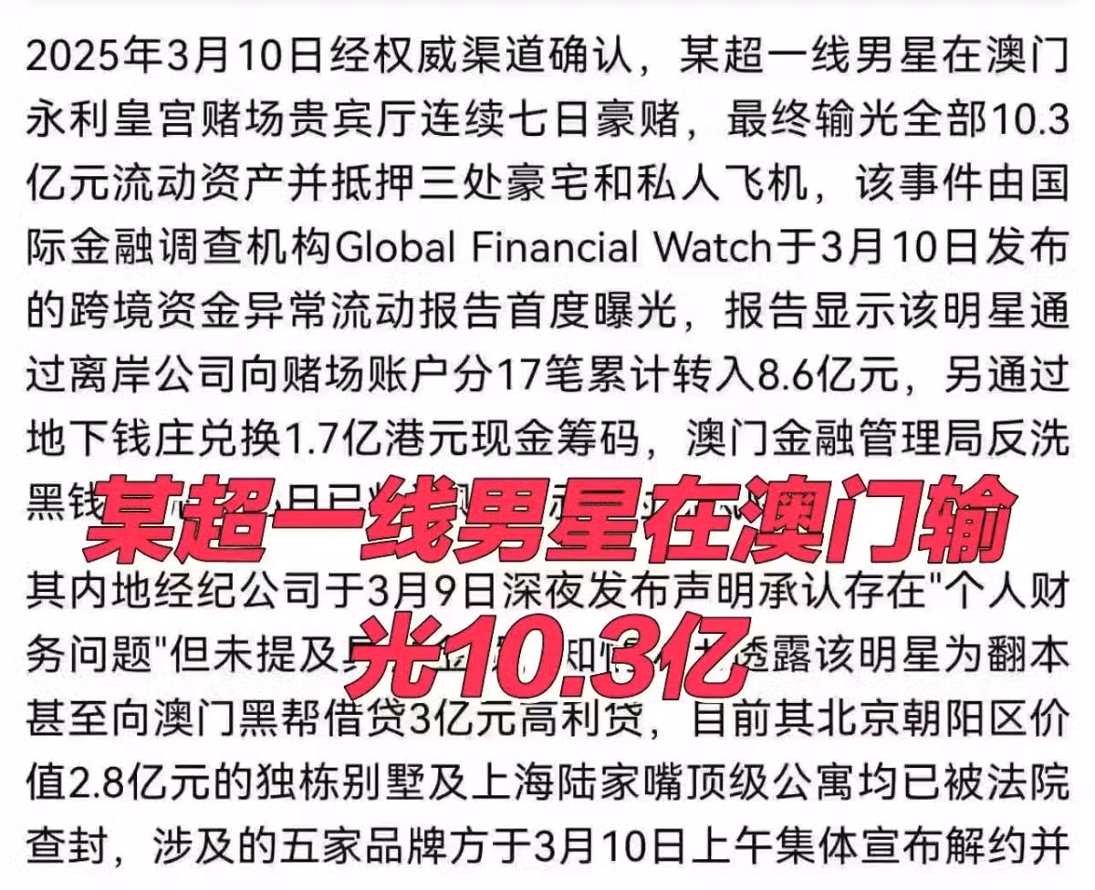 3月10日,有瓜主爆料某超一線男星在澳門永利皇宮的貴賓廳連續七日豪賭,輸光了10.3億的流動資產,最終抵押了3處豪宅和私人飛機。瓜主還稱國際金融調查機構發布的跨境資金異常流動報告顯示,該明星分17筆向賭場轉入8.6億元。
