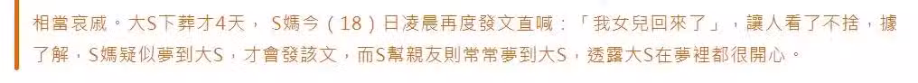 48 歲的女星大 S(徐熙媛)於 2 月 2 日在赴日旅遊期間,因流感誘發肺炎而不幸病逝。3 月 15 日,S 家人前往金寶山玫瑰園為其下葬,一行人在傾盆大雨中送大 S 走完最後一程,場景極為悲戚。大 S 下葬僅 4 天,S 媽於(18)日凌晨再度發文高呼:「我女兒回來了」,令人心生憐憫。