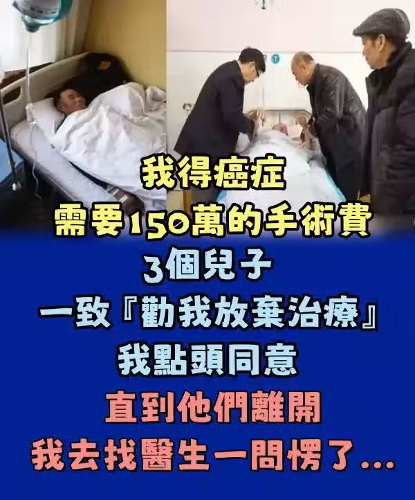 我得癌症需要150萬的手術費 3個兒子一致『勸我放棄治療』我點頭同意 直到他們離開我去找醫生一問愣了~