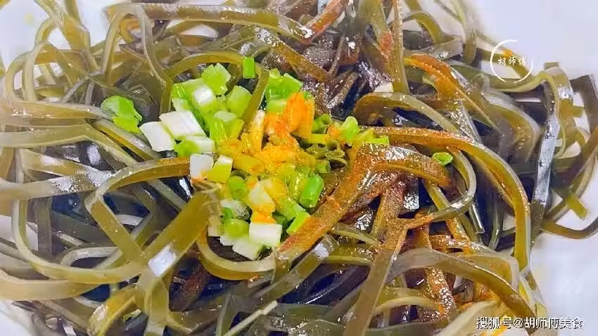 第三步:將生抽、陳醋、雞精、辣椒油、十三香、食鹽、香油、蔥花全部放入到海帶中攪拌均勻,然後腌制15分鐘,這樣能使海帶絲更入味。