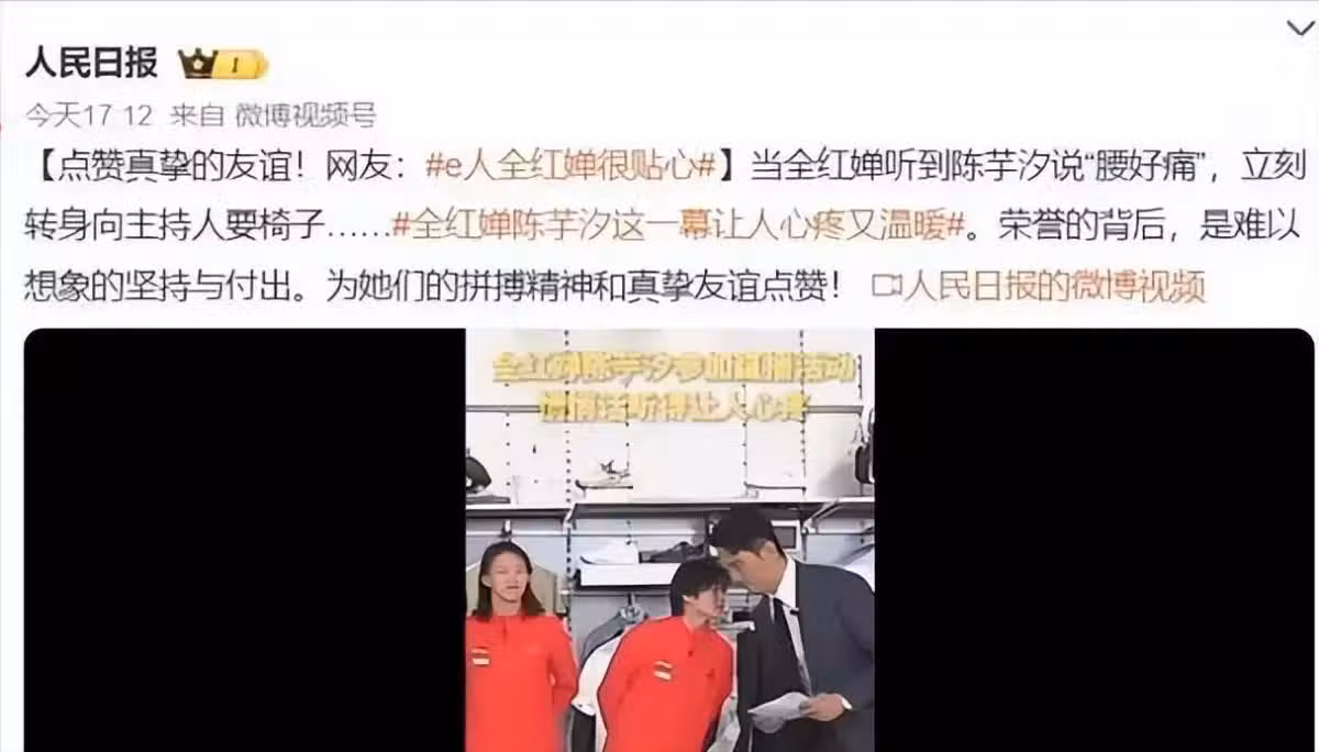而全紅嬋則暖心的像主辦方索要椅子給陳芋汐坐下,這一行為也得到了人民日報的發聲讚美。
