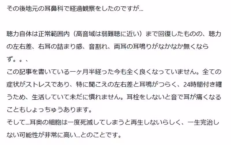 「當我得知這個事實的時候,情緒整個崩潰,不顧年紀大哭了一場。 為什麼我當時沒戴耳塞?為什麼會坐在那麼靠近喇叭的位子?為什麼身體狀況不佳還跑去遠征?接著,我陷入了遷怒他人的惡性循環,最後甚至開始想:『如果當初沒喜歡上《偶像大師 閃耀色彩》,就不會發生這種事了吧⋯⋯?』」