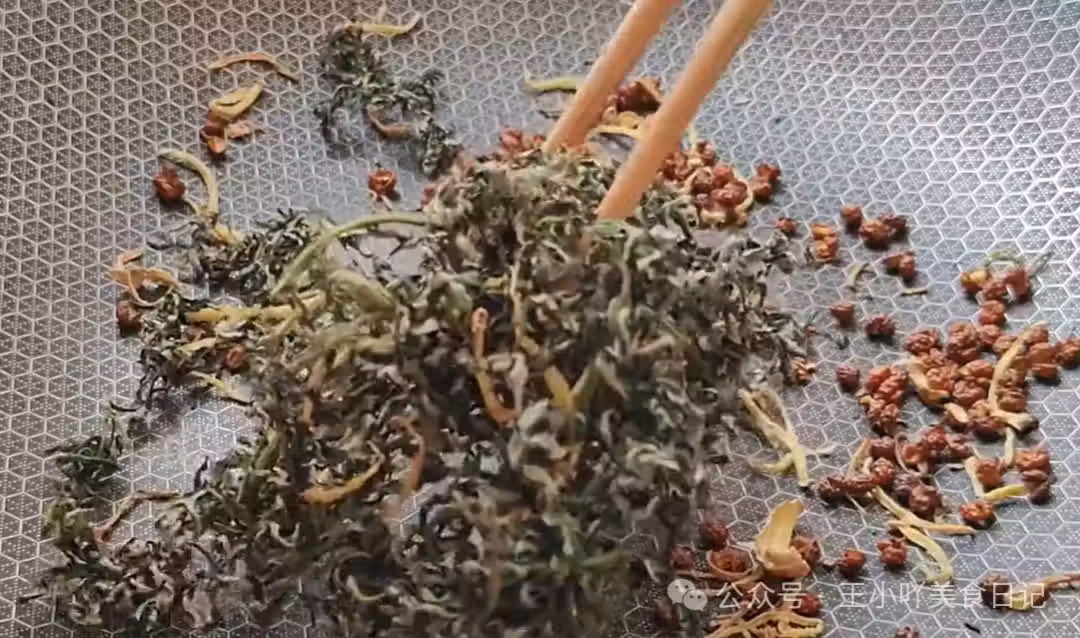 當炒到水分基本被炒干時,再把準備好的花椒加進來。繼續開小火翻炒,讓花椒與艾草、生薑絲充分混合,炒出濃濃的香味。當能聞到它們獨特的香氣時,就可以關火了,但不要立刻將食材從鍋中取出,讓它們在鍋里保留溫熱,這樣能讓香味更好地融合。
