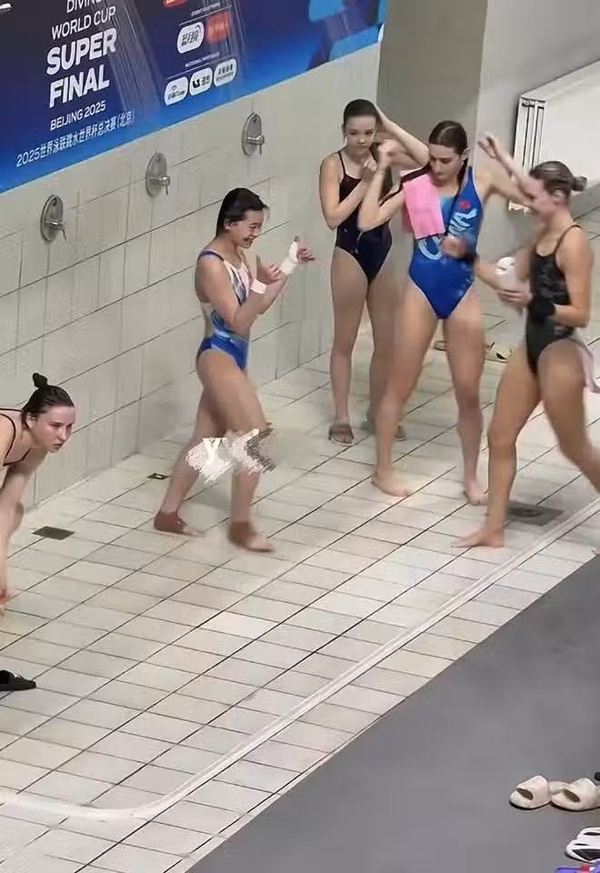 跳水運動員齊聚水立方,英國好閨蜜熊抱全紅嬋,兩人笑的燦爛