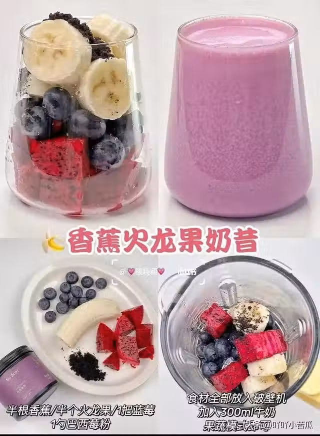 食材:香蕉1根+火龍果1/4個+藍莓10顆+1勺巴西莓粉+200ml牛奶。