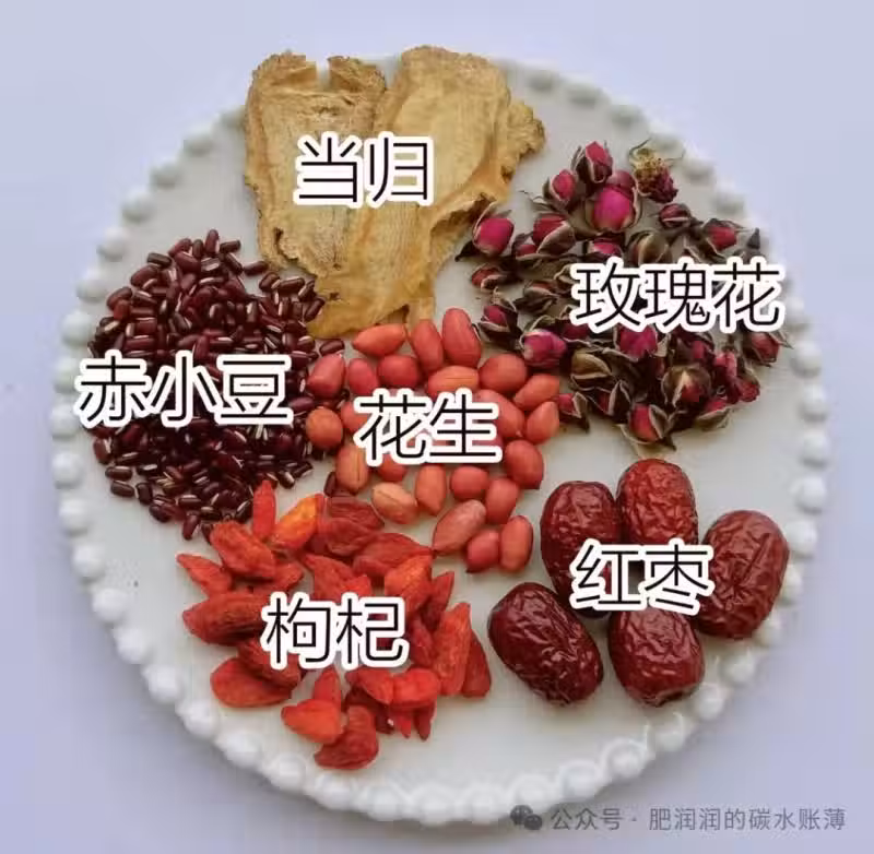 食材:赤小豆10g+當歸3g+玫瑰花3g+枸杞3g+紅棗2顆+花生10g