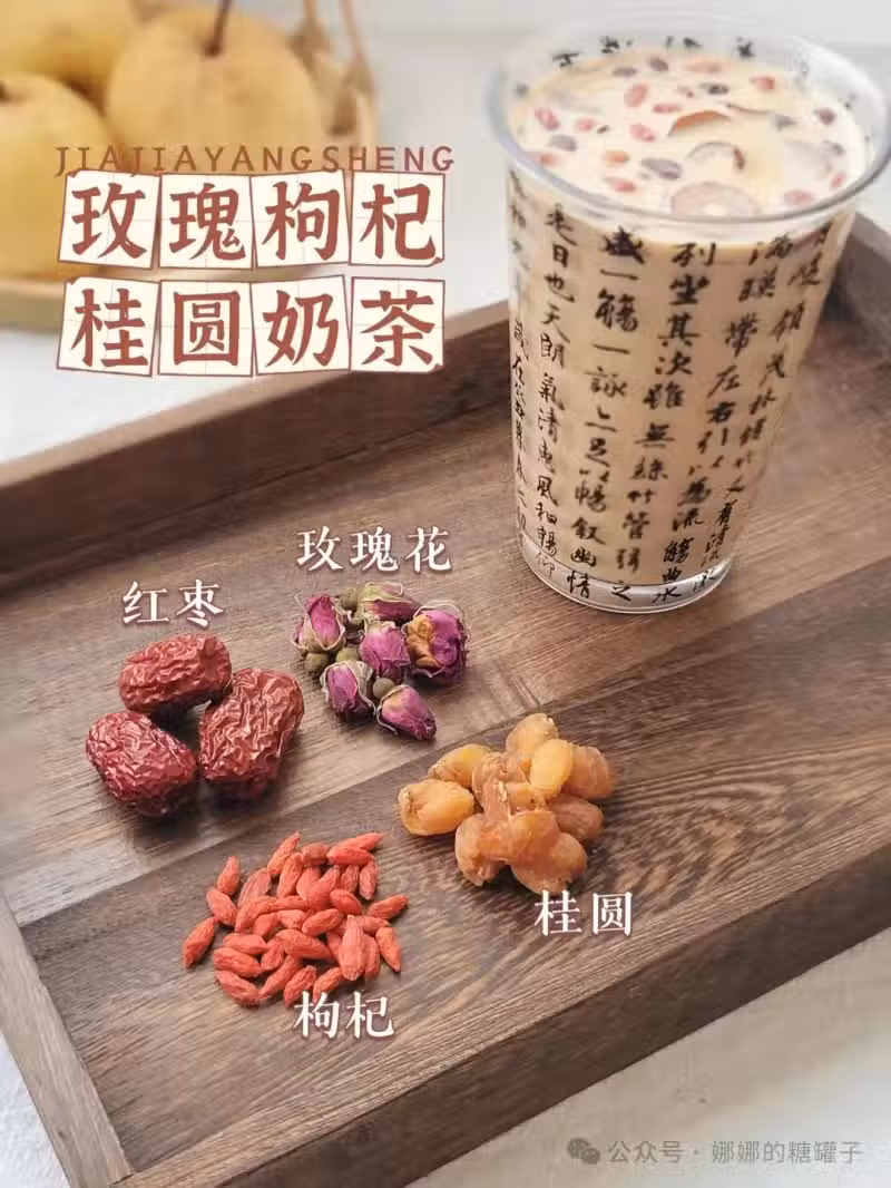 食材:紅棗、桂圓、玫瑰花、枸杞、牛奶。