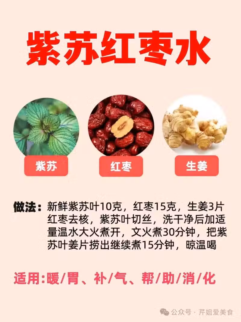 補氣養血:紅棗補血,生薑溫陽,紫蘇理氣,適合氣血不足、手腳冰涼者。