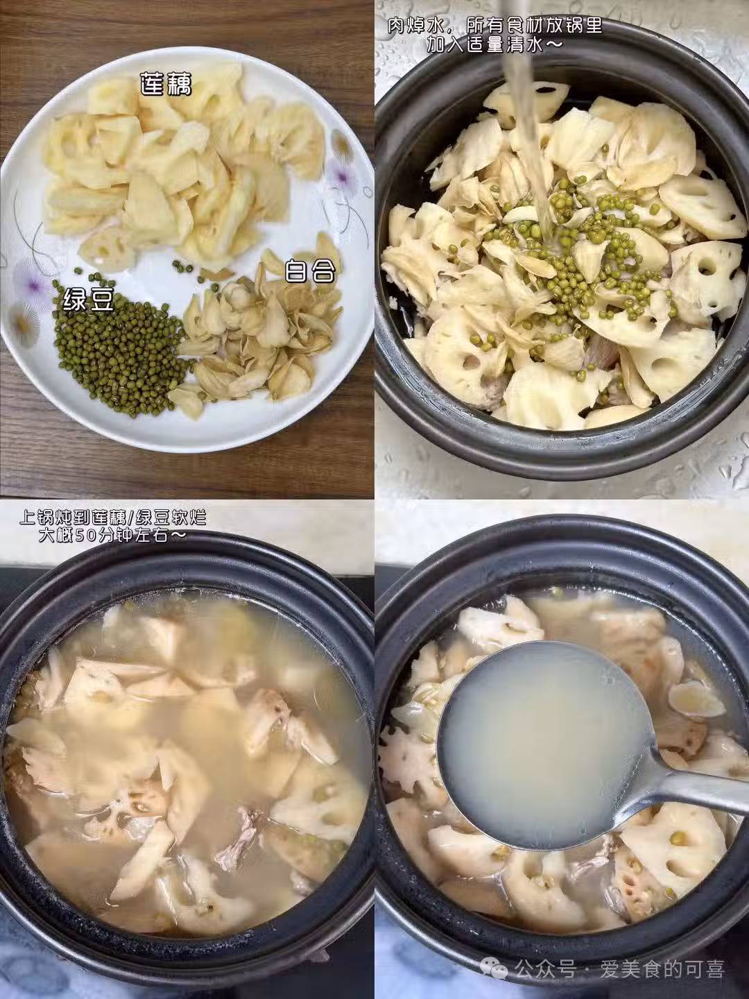 2️⃣準備好的食材,一起放入砂鍋中,加入適量的清水,大火燒開後轉中小火燉制50分鐘左右,燉到蓮藕,綠豆軟爛就可以加點食鹽,盛出來飲用啦!
