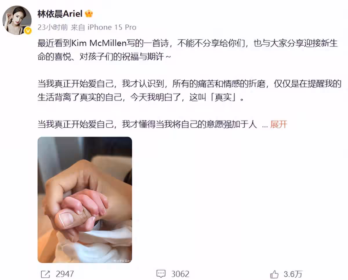 2025年6月16日,林依晨在社交平台曬出一張新生兒緊握她手指的照片。