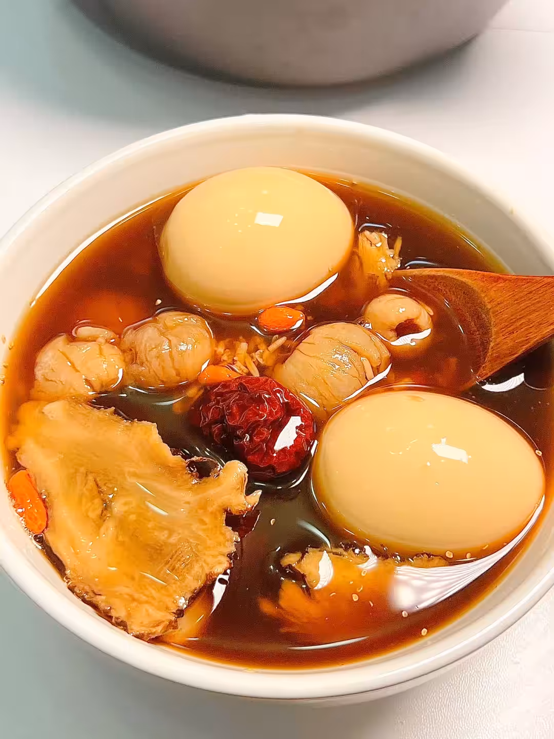 1.雞蛋洗洗乾淨哦~ 要帶殼煮 ; 2.除了枸杞、酒釀,所有食材放入砂鍋中➕500-600ml清水,小火燉煮15分鐘! 33.把煮熟的雞蛋殼敲碎; 4.蓋上鍋蓋繼續燉煮10分鐘; 5.放入酒釀、枸杞關火即可! 這些湯品都極為家常,不妨時常動手做做,品嘗其美味。新的一年裡,衷心祝願姐妹們身體健康,活力滿滿,永遠保持著青春的容顏與迷人的風采。