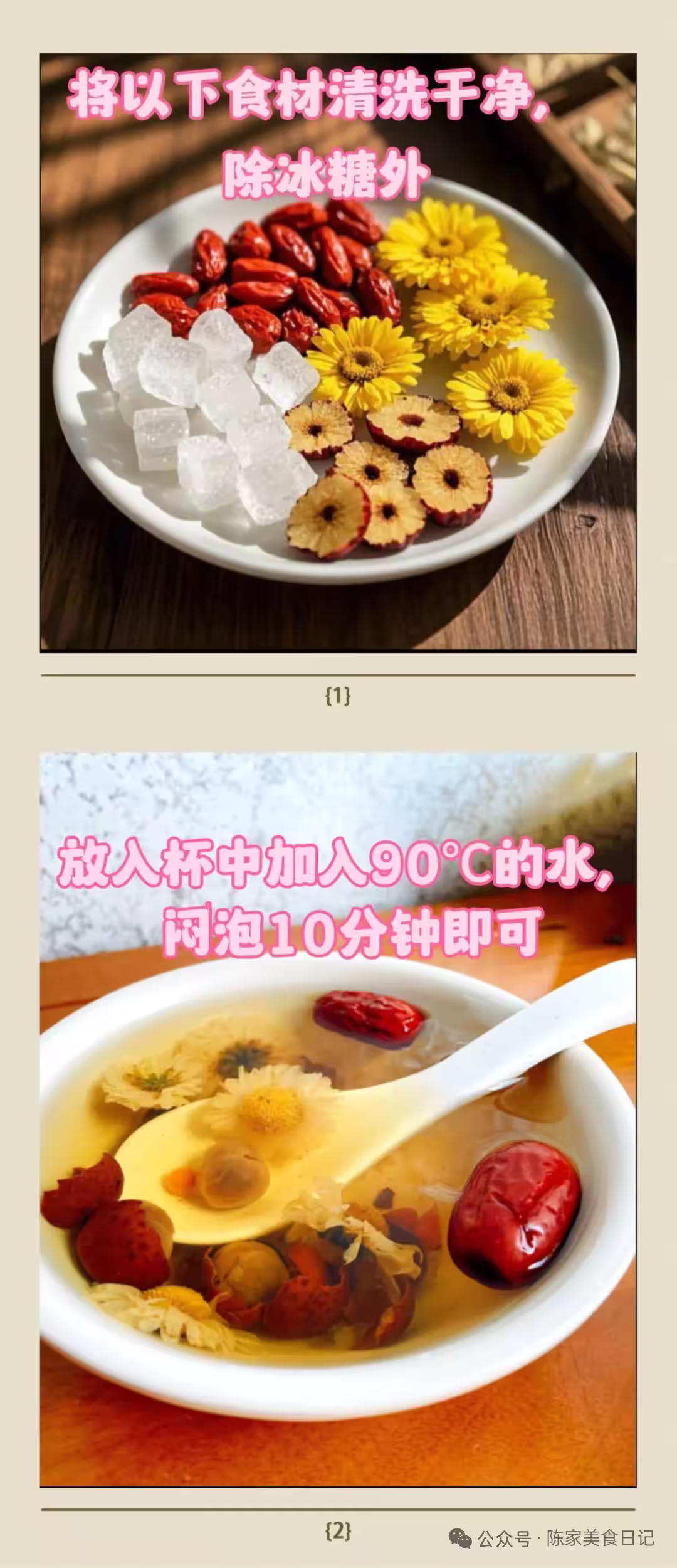 菊花性涼,脾胃虛寒的人少放些。喝完茶後,枸杞可以嚼著吃掉,不浪費營養。