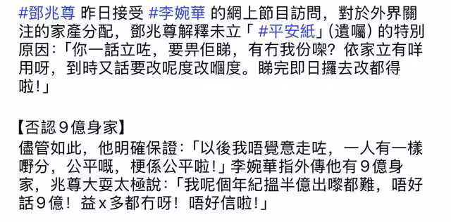 雖然不立遺囑,但是還是會為後事考慮,就如之前所說的,人生無常,哪天說走就走,這就不得不考慮怎麼安置三個女友。鄧兆尊直言已經預算號了,三個女友一人一份,自己一定會做到公平處理,不會讓三個女友遺憾。而談及分產的問題,自然就會涉及到資產問題,鄧兆尊的資產是個很敏感的話題,他是不會公開資產的多少,外界盛傳他有9億,他對此予以否認,甚至稱連半億都沒有,顯然就是太低調,太謙虛了。
