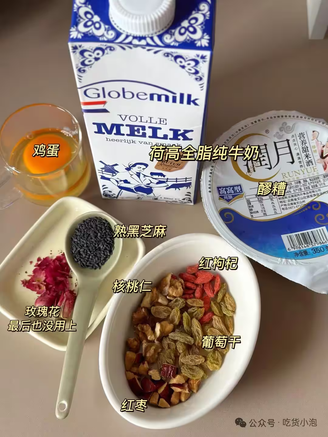 荷高全脂牛奶150克、雞蛋1個、醪糟2勺、熟黑芝麻適量、紅棗1個、枸杞5克、葡萄乾10克、玫瑰花瓣一朵。