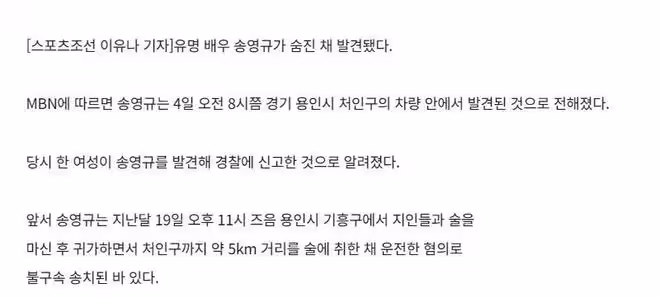 此前,宋英奎曾因涉嫌於上月19日晚11時左右在龍仁市器興區與友人飲酒後,在醉酒狀態下駕車約5公里返回處仁區住所,被警方不拘留移送檢方。