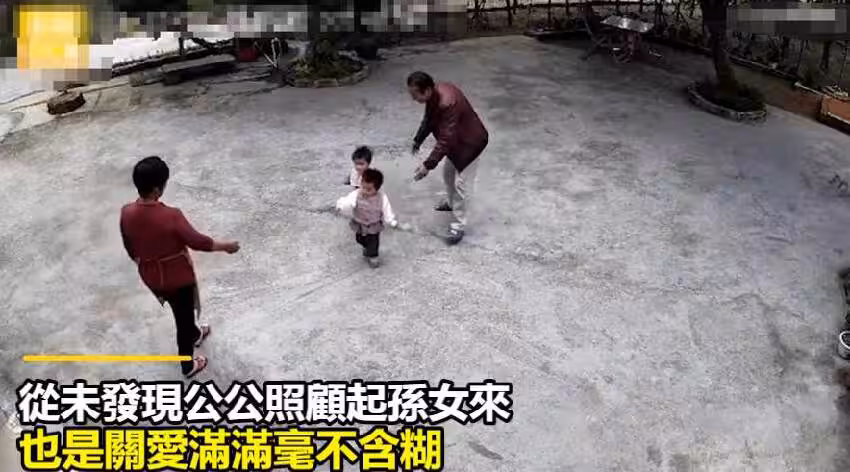 當孫女蹣跚學步走向外面玩耍時,公公寸步不離地跟在後頭,彎著腰隨時準備攙扶,擔心小娃摔倒。
