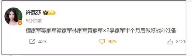 許荔莎在線喊話:檀家軍、冪家軍、譚家軍、林家軍、黃家軍、李家軍半個月後做好戰鬥準備。