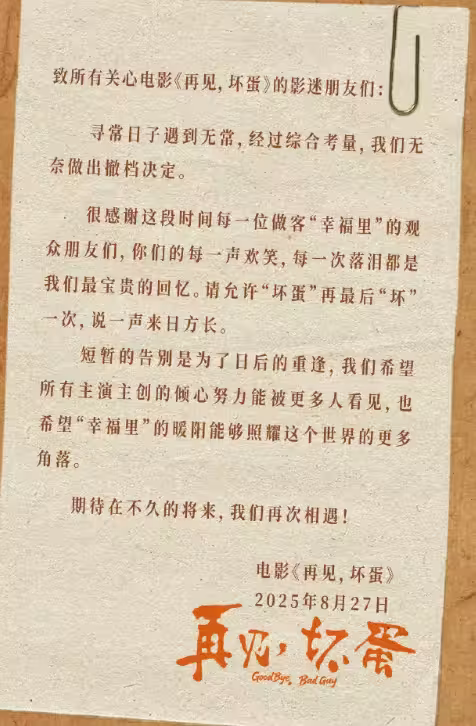 電影《再見,壞蛋》官宣撤檔,官方沒有給出具體的原因,只道是「尋常日子遇到無常」。