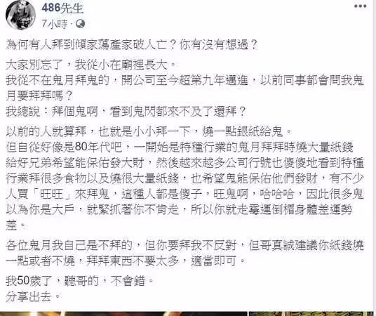 很多好兄弟會以為你是大戶,就緊抓著你不肯走,所以你就走霉運倒楣身體差運勢差,農曆七月要拜可以,但紙錢只要燒一點,或是一點都不燒,拜拜供品不用太多,聽哥的,不會錯。」。